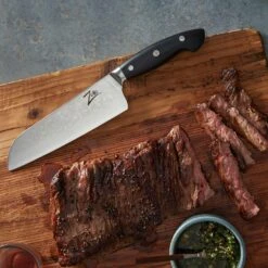 Unser Santokumesser der Executive-Plus Serie von Zelite Infinity by Klarstein besitzt eine 45-lagige Damastklinge und einen gebogenen Bauch. Es ist ist ein echter Hingucker und perfekt zum Hacken, Schneiden und Würfeln von Obst, Gemüse, Fleisch ohne Knochen und Fisch geeignet. Die breite Klinge eignet sich ideal für den Transport von zerkleinerten Lebensmitteln. Durch den ergonomischen G10-Griff mit Buckelrücken gestaltet sich die Zubereitung von Speisen präzise, effizient und vor allem bequem.