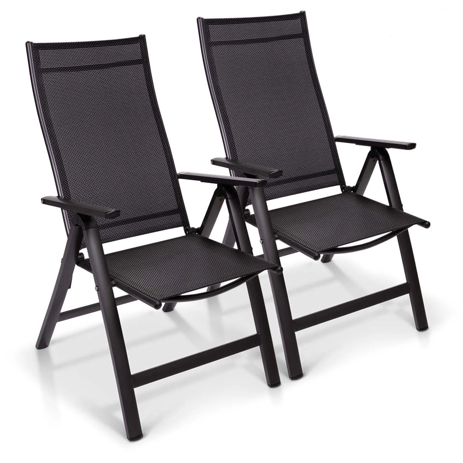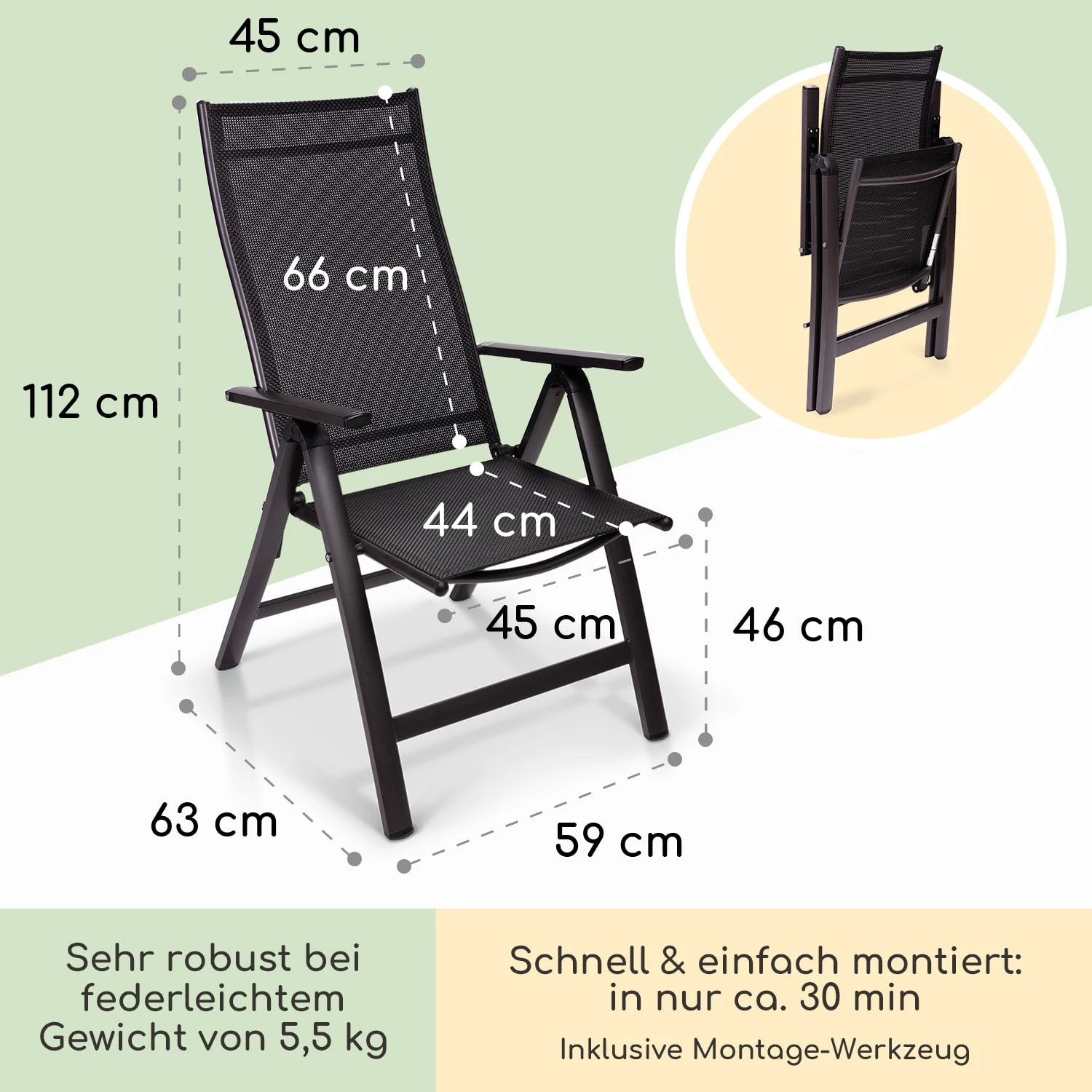 Mit dem blumfeldt London Gartenstuhl kannst du dank der hochwertigen Bespannung aus Textilene ruhen wie auf Wolken. Damit er auch allen Entspannungsansprüchen gerecht wird, ist seine Rückenlehne 5-fach verstellbar und ermöglicht insgesamt 6 Sitzpositionen. Das Geflecht aus Textilene ist witterungsbeständig, trocknet besonders schnell und kann problemlos gereinigt werden. So ist der Stuhl jederzeit für das nächste Sonnenbad einsatzbereit. Auch der langfristige Nutzwert kommt nicht zu kurz: Das Gestell ist aus stabilem Aluminium gefertigt, sodass der Klappstuhl gerade einmal 5,5 kg wiegt. Eine Pulverbeschichtung des Rahmens sorgt für zusätzliche Witterungsbeständigkeit. Dank einfachem Klappmechanismus kann der Stuhl mit wenigen Handgriffen auf handliche Maße zum Verstauen oder für den Transport zusammengefaltet werden. Für maximalen Schutz sorgt ein Klappsicherungshebel, der das ungewollte Zusammenklappen des Gartenstuhls verhindert. Und da es sich zu zweit meist am schönsten Entspannt, werden die Gartenstühle direkt im praktischen 2er-Set geliefert.