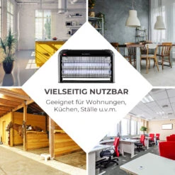 Die Mosquito Ex 5000 Insektenfalle hilft Stechmücken, Fliegen und andere lästige Plagegeister in Wohnungen, Küchen oder Ställen zu beseitigen und schafft ganz ohne Chemikalien Erleichterung. Dabei werden die Insekten von 2 UV-Röhren mit jeweils 15 Watt angelockt und durch Hochspannungsdrähte mit 2200V schnell getötet. Durch die Verwendung von Schwarzlicht funktioniert die Falle sowohl bei Tag als auch bei Nacht.