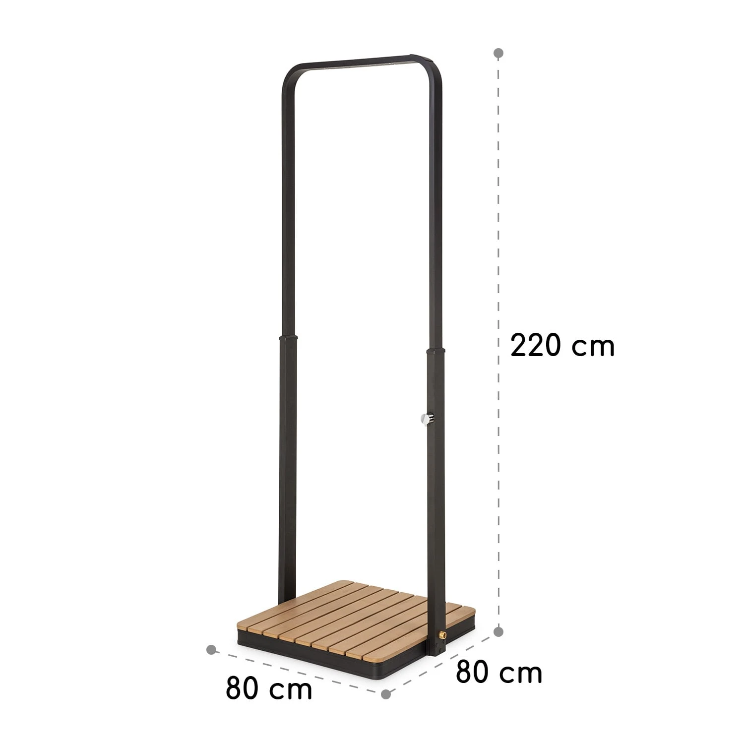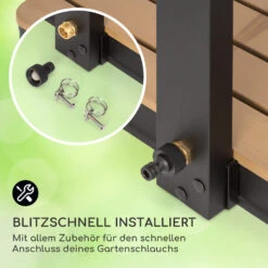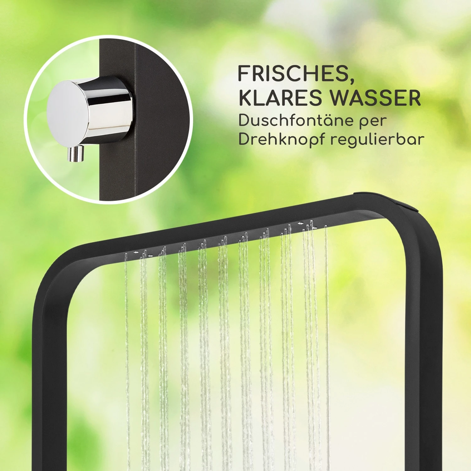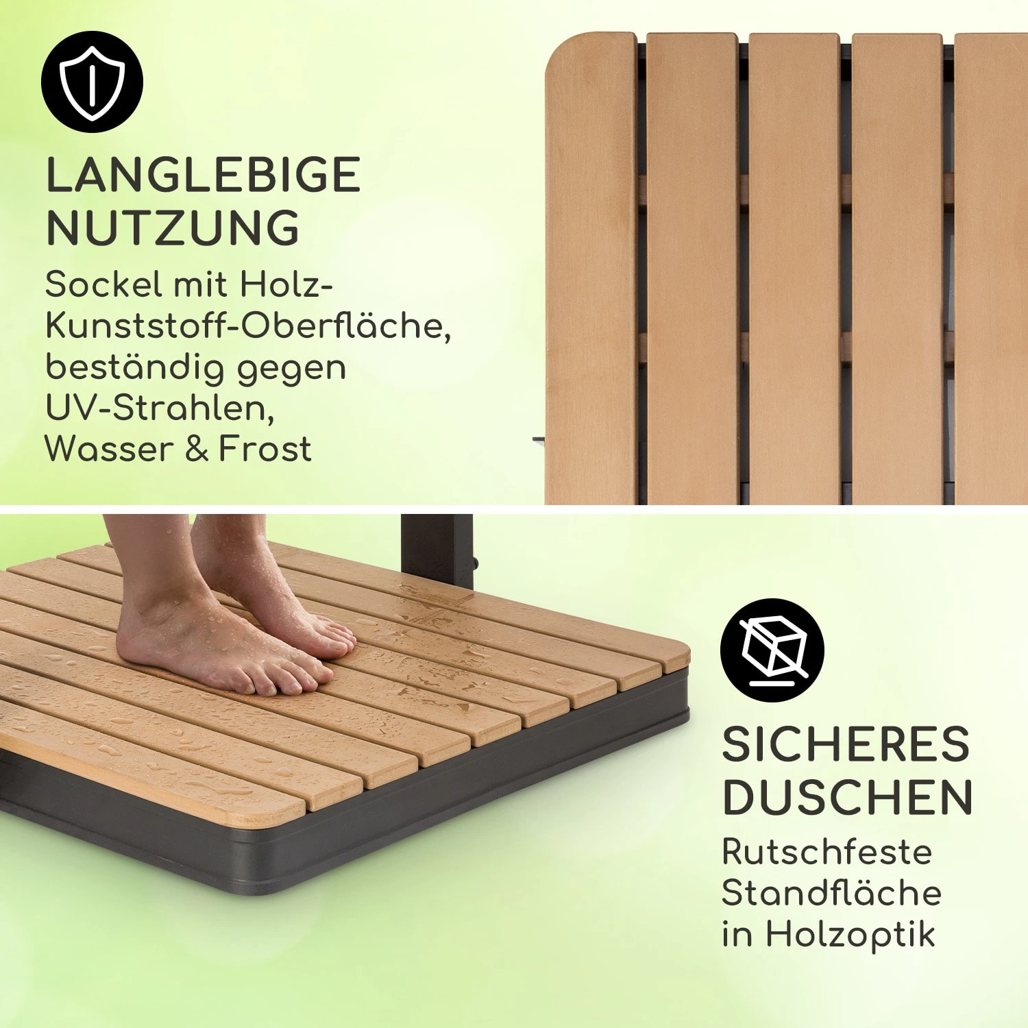 Dieses Jahr wird es ganz einfach im Garten einen kühlen Kopf zu bewahren. Dafür sorgt die Blumfeldt Sumatra Breeze Außendusche auf einfache und effektive Weise. Das kühle Erfrischungswunder wird einfach an einen Gartenschlauch angeschlossen und schon kann der Spaß beginnen. Mit einem Fußstellrad wird nicht nur das Wasser aufgedreht, sondern auch die Höhe der Fontänen bis 4 Metern reguliert. Dabei erfrischt die Dusche gleich doppelt, denn hier kommt das Wasser aus dem Boden. Einmal von untenkühl abspritzen und dann noch einmal sanft von oben berieseln lassen. Damit eignet sich die Blumfeldt Sumatra Breeze auch perfekt als Saunadusche – vor allem, da sie selbst in begrenzten Platzverhältnissen leicht einen Platz findet. Für langanhaltende Erfrischungsfreuden sorgt der clevere Mix aus robusten Materialien. Die Basis der Dusche ist aus eloxiertem Aluminium gefertigt und wird von einem rutschfesten Top aus WPC, Wood-Plastic-Composite, gekrönt. Das besteht nicht nur zu 60 % aus Holz und schont damit die natürlichen Ressourcen, es ist auch unempfindlich gegen Schimmel, Frost, Wasser und UV-Strahlung und lässt sich besonders einfach reinigen.