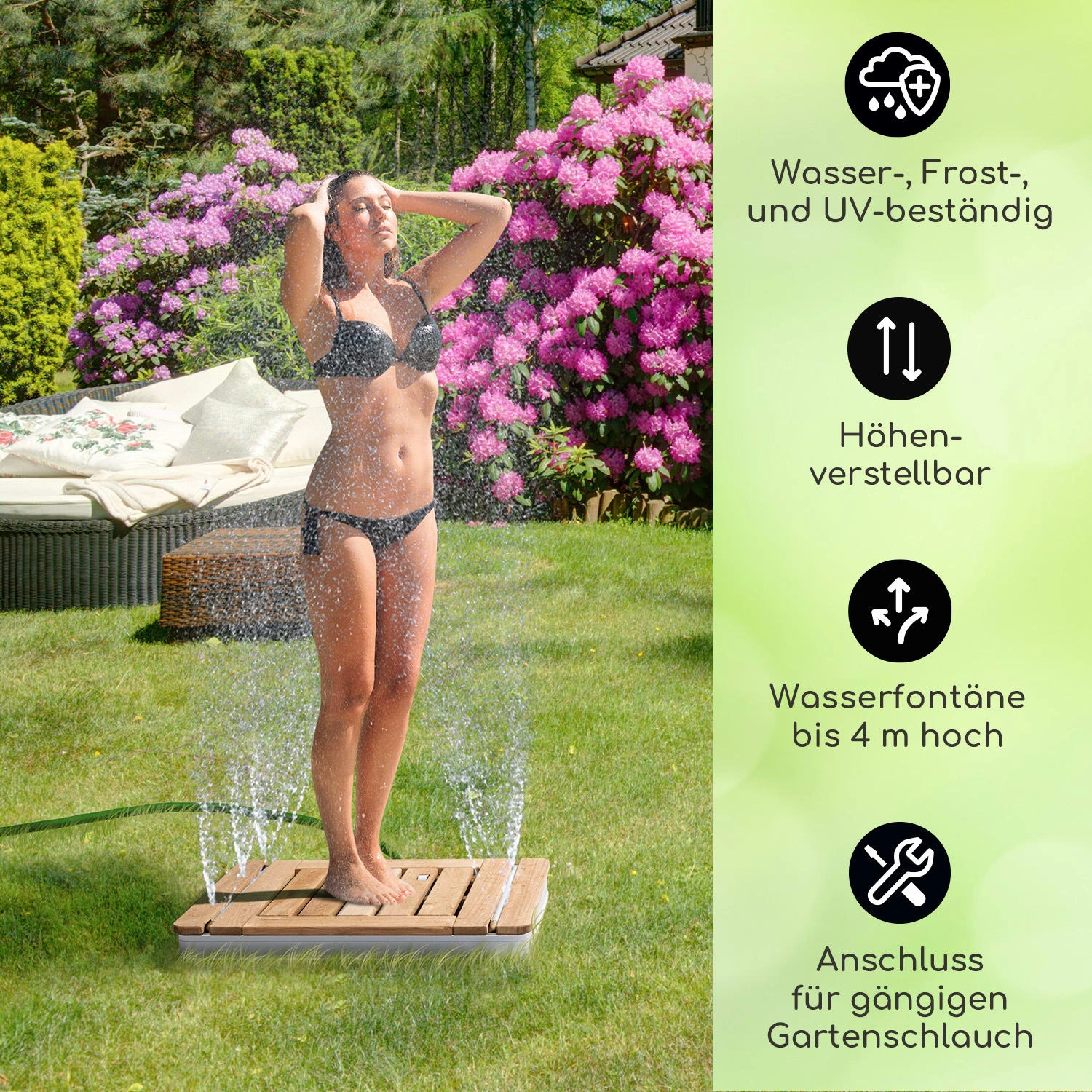 Dieses Jahr wird es ganz einfach im Garten einen kühlen Kopf zu bewahren. Dafür sorgt die blumfeldt Sumatra Teak Square Außendusche auf einfache und effektive Weise. Das kühle Erfrischungswunder wird einfach an einen Gartenschlauch angeschlossen und schon kann der Spaß beginnen. Mit einem Fußstellrad wird nicht nur das Wasser aufgedreht, sondern auch die Höhe der Fontänen bis zu 4 Metern reguliert. Dabei erfrischt die Dusche gleich doppelt, denn hier kommt das Wasser aus dem Boden. Einmal von unten kühl abspritzen und dann noch einmal sanft von oben berieseln lassen. Damit eignet sich die blumfeldt Sumatra Teak Square auch perfekt als Saunadusche – vor allem, da sie selbst in begrenzten Platzverhältnissen leicht einen Platz findet. Für langanhaltende Erfrischungsfreuden sorgt der clevere Mix aus robusten Materialien. Die Basis der Dusche ist aus eloxiertem Aluminium gefertigt und wird von einem rutschfesten Top aus Teakholz gekrönt. Teak ist besonders unempfindlich gegenüber Schädlingen, Pilzbefall, Frost und Wasser, zusätzlich lässt es sich besonders einfach reinigen.