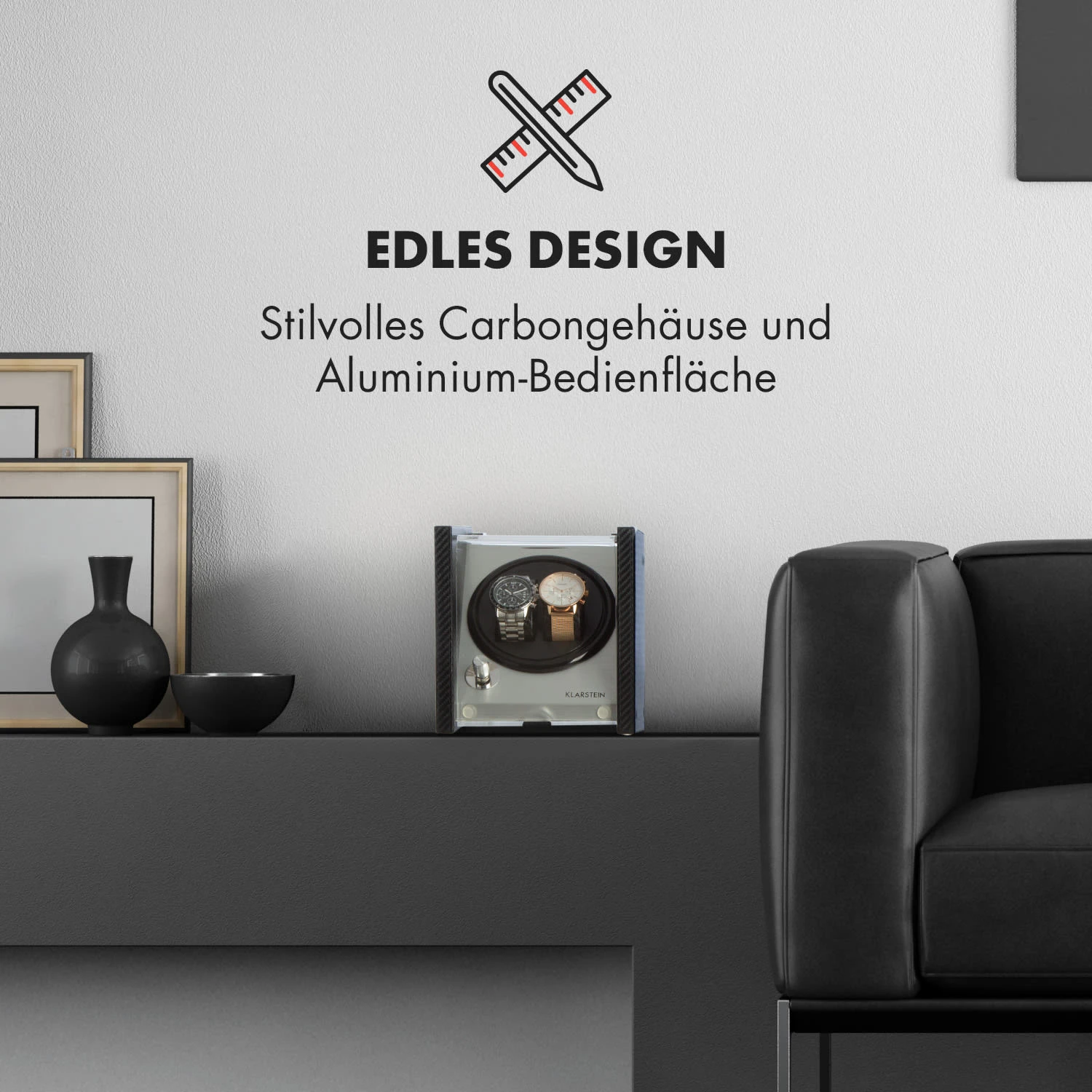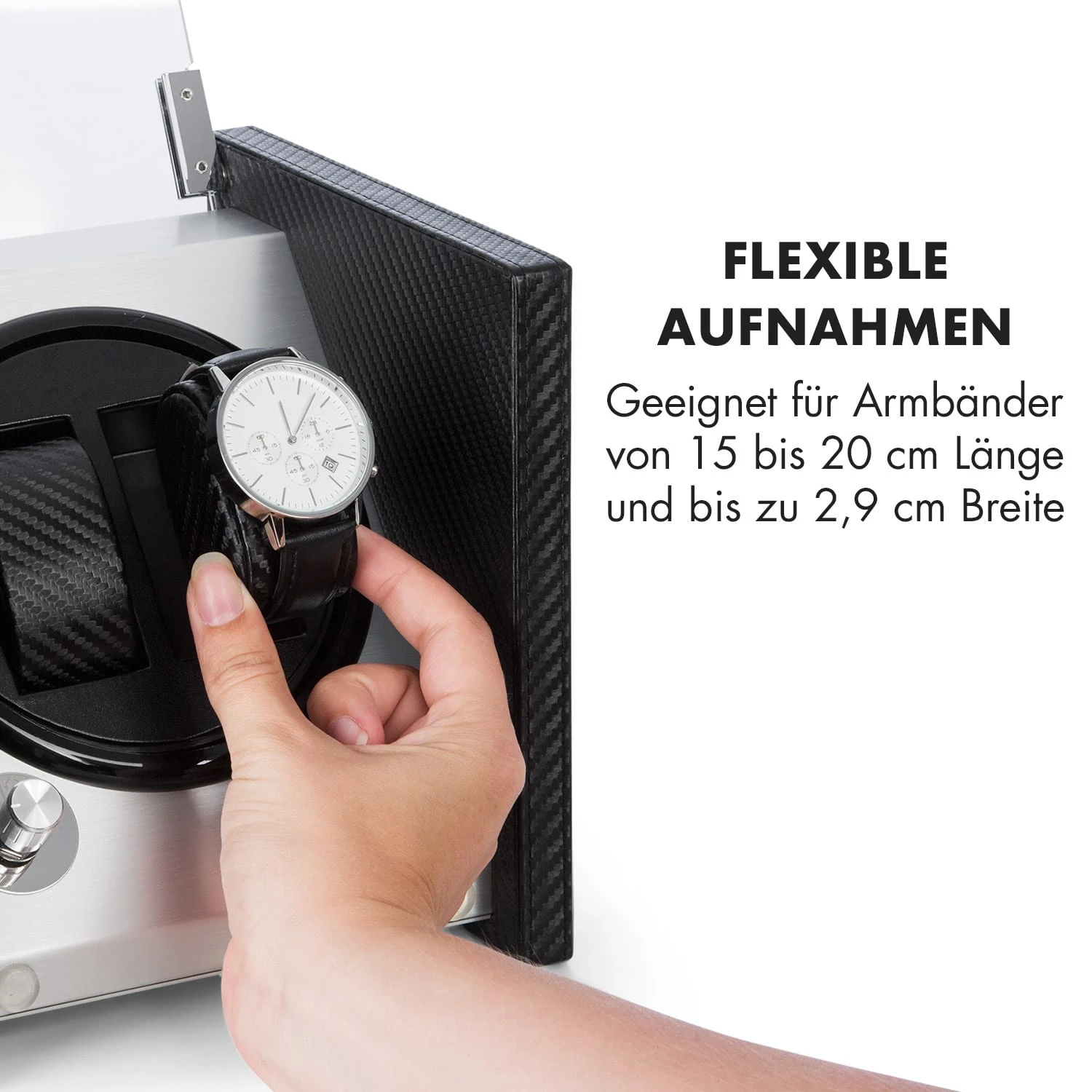 Der Tokyo 2 Uhrenbeweger überzeugt mit einem eleganten Gehäuse im Carbonfaser-Look, das sich stilvoll in jedes Raum-Ambiente einfügt. Eine Bedienfläche aus gebürstetem Aluminium verleiht der Konstruktion seinen unverwechselbaren Glanz, währende das großzügig geschnittene, von oben und frontal einsehbare Sichtfenster aus Acrylglas einen unverstellten Blick auf die Automatikuhren freigibt.