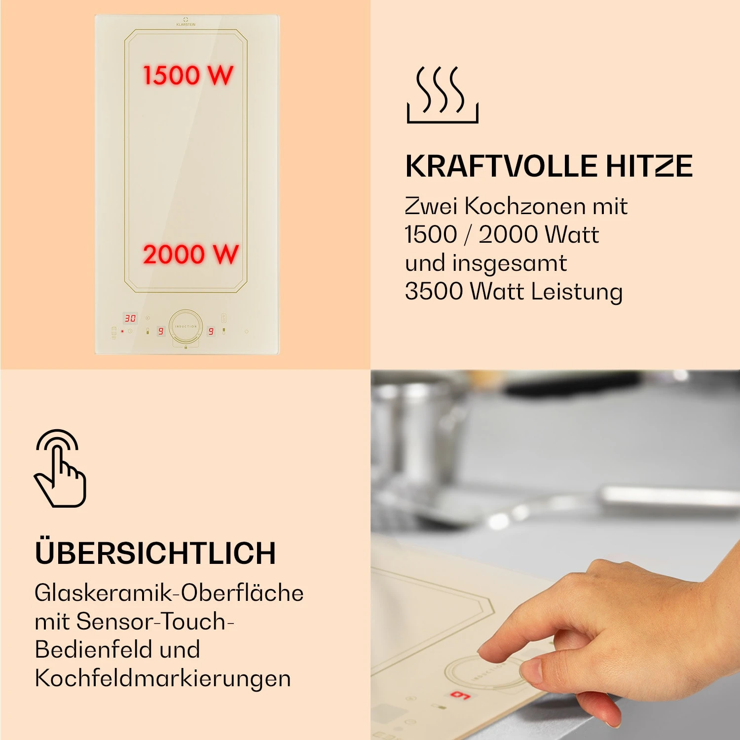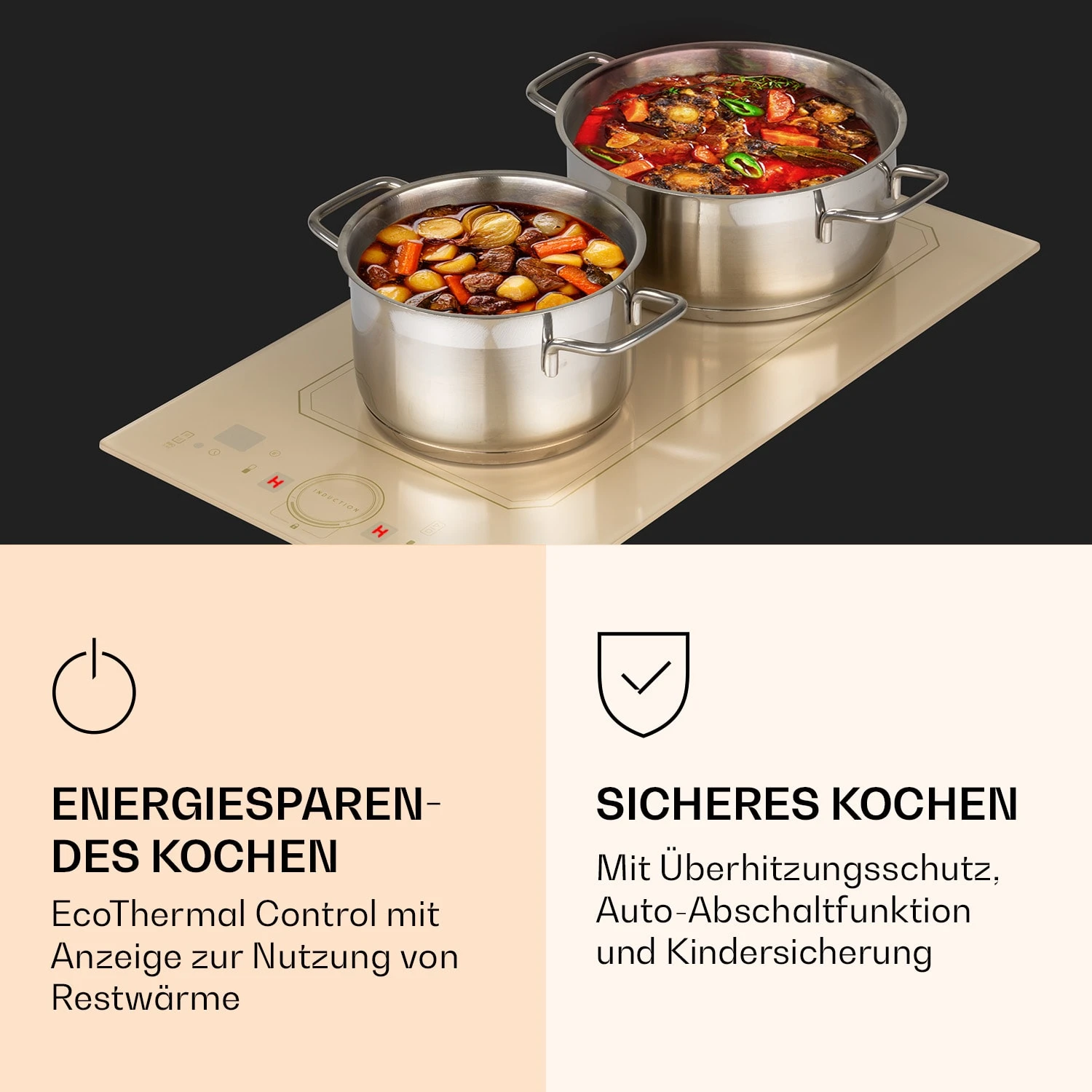 - ThermoBoost-Funktion: für 1800 und 2300 Watt je Kochfläche