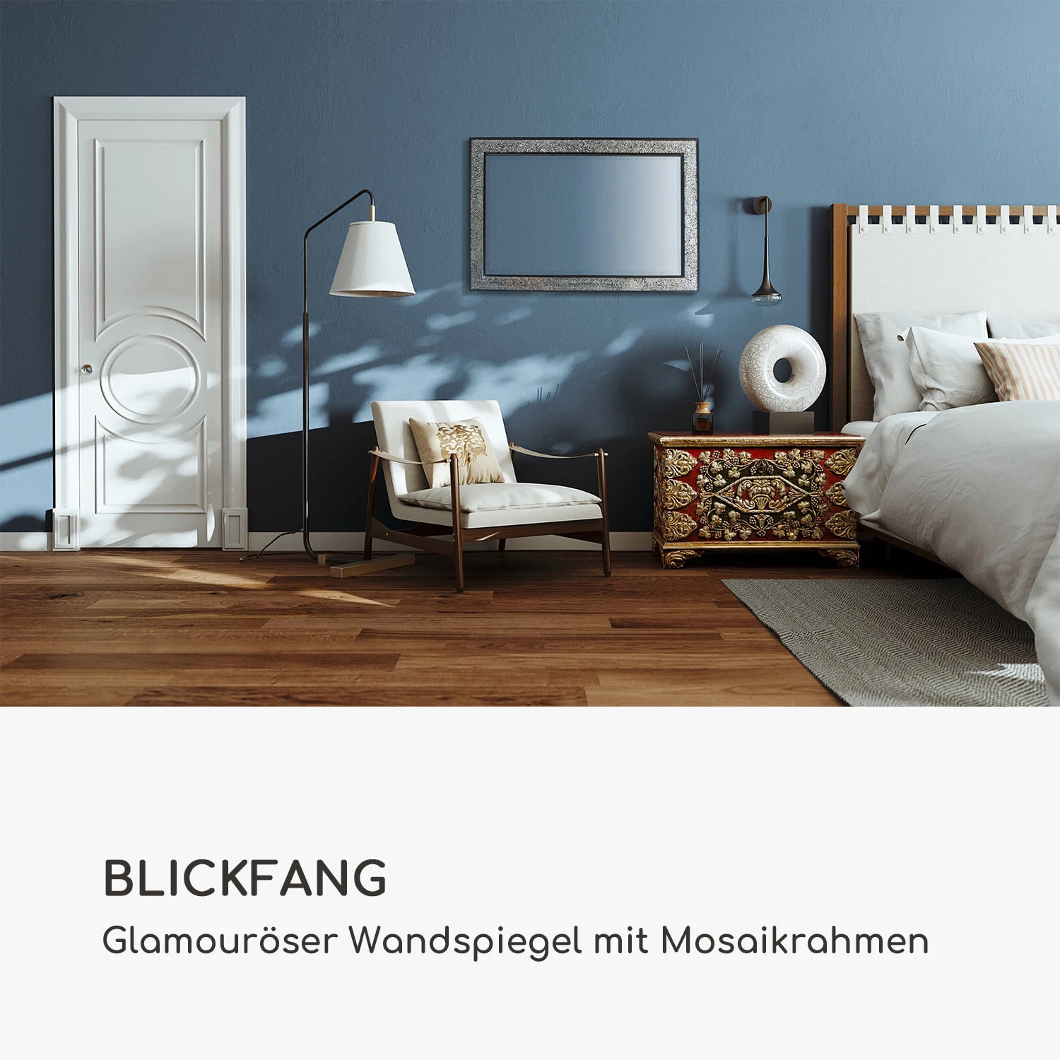 Der Watford Wandspiegel von Casa Chic by blumfeldt ist inspiriert von den Lichtern und dem Glamour Hollywoods und verleiht deinem Interieur einen luxuriösen Charme. Der Rahmen aus winzigen Glasfliesen mit Mosaikeffekt erzeugt ein atemberaubendes Spiel aus Licht und Reflexion. Dieser moderne, schillernde Akzentspiegel ist das perfekte Wandelement für Wohnzimmer, Schlafzimmer oder den Flur und kann sogar als Kosmetikspiegel verwendet werden. Gefertigt aus hochwertigen Materialien bietet er eine kristallklare und verzerrungsfreie Reflexion.